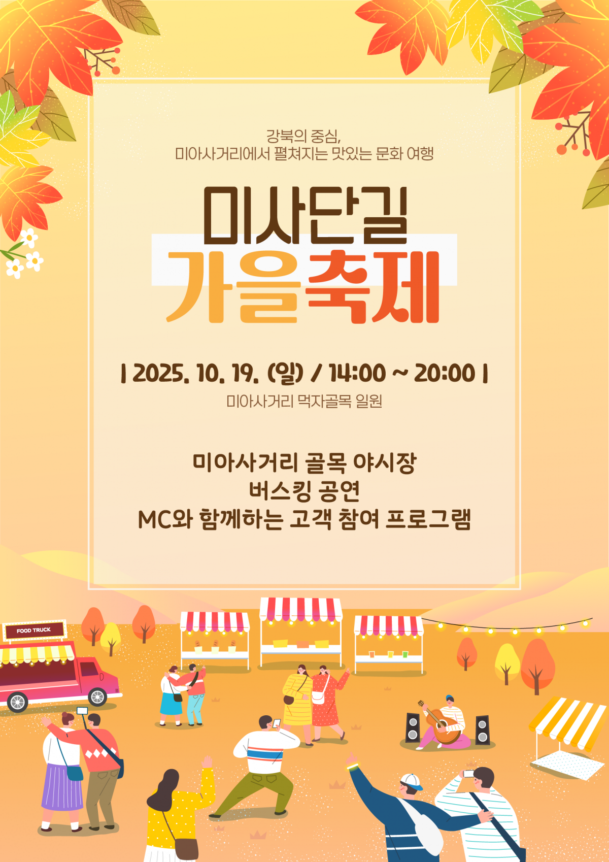 2025 강북 골목상권 모담장터(10.11.), 사일구로 구름축제(10.17.~18.), 미사단길 가을축제(10.19.) 안내