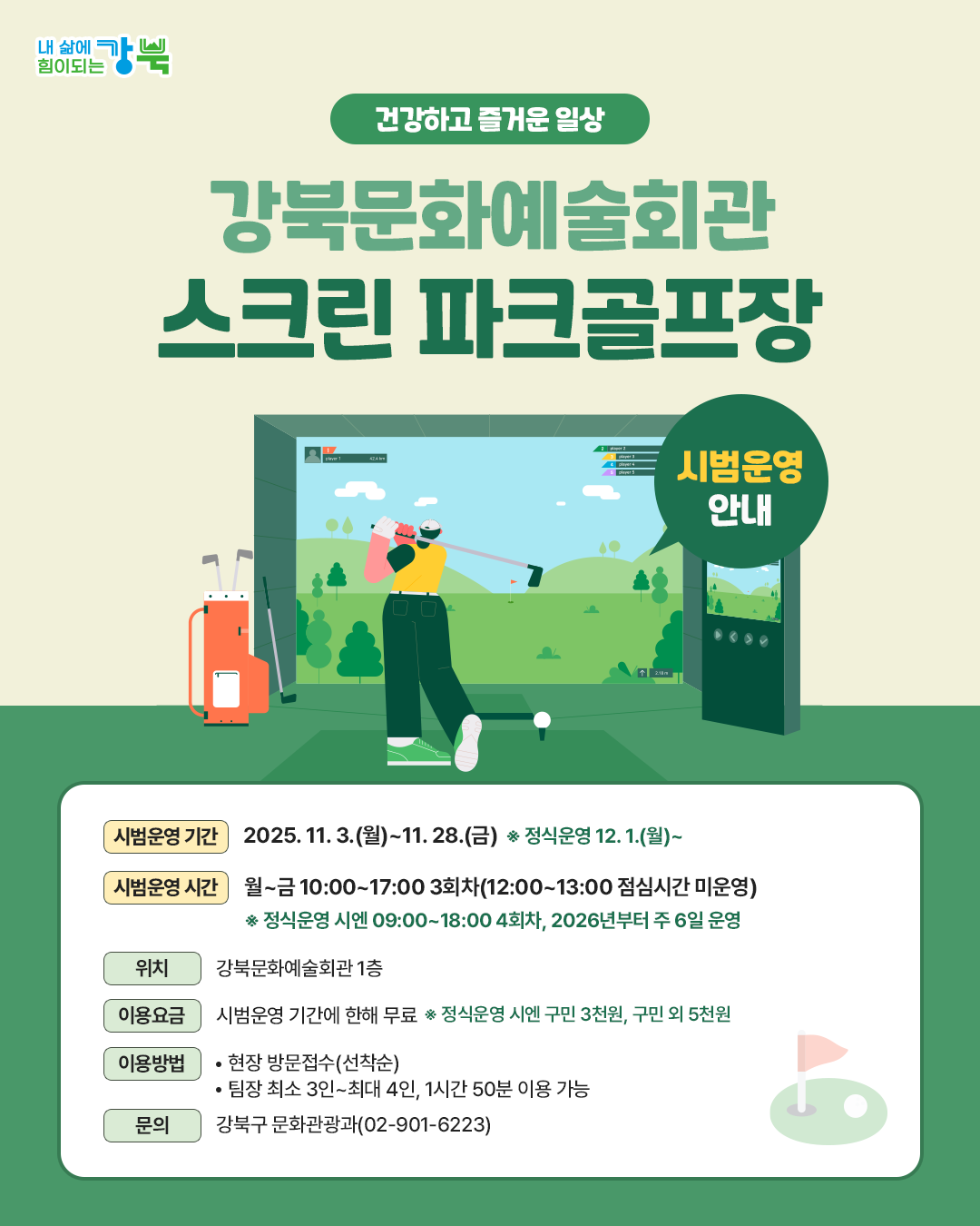 [강북문화예술회관 스크린 파크골프장 시범운영 안내]