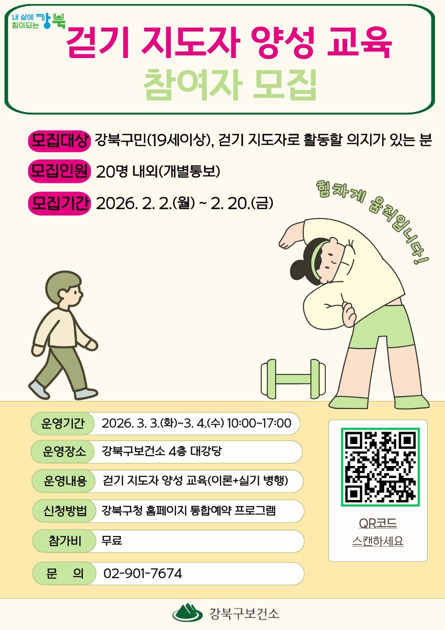 2026년 강북구 걷기 지도자 양성교육 참여자 모집(2.2.~2.20.)