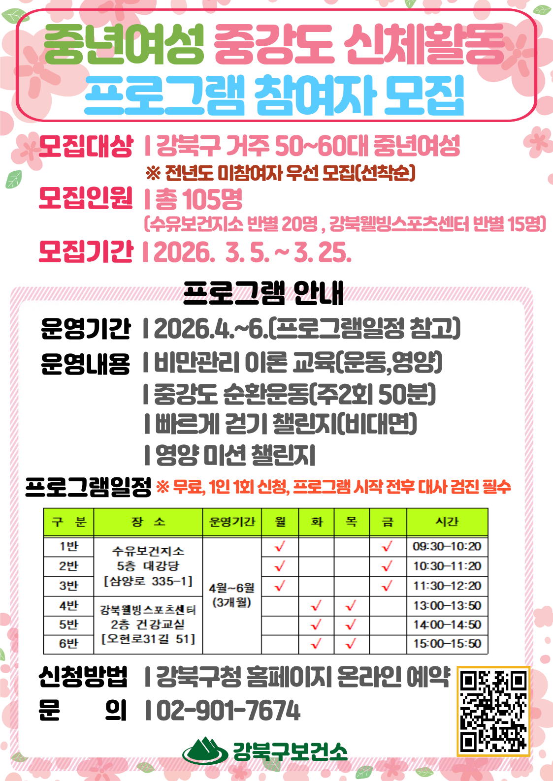2026년 상반기 중년여성 중강도 신체활동 참여자 모집(3.5.~3.25.)