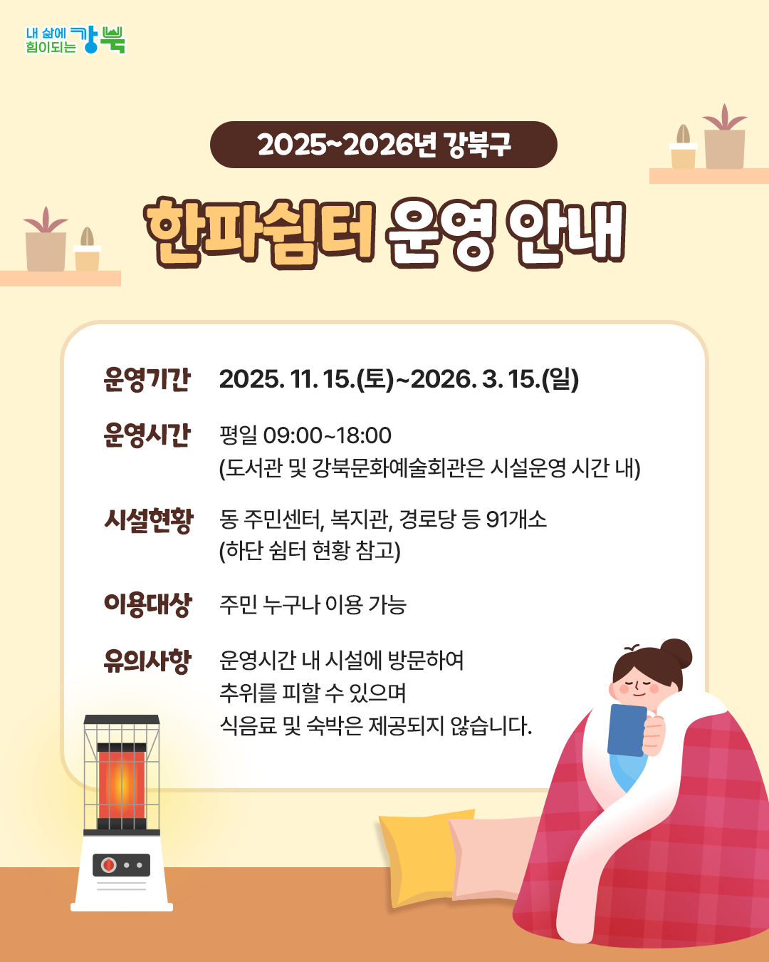 2025~2026년 강북구 한파쉼터 운영(11. 15.부터)